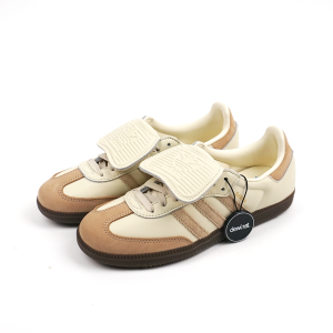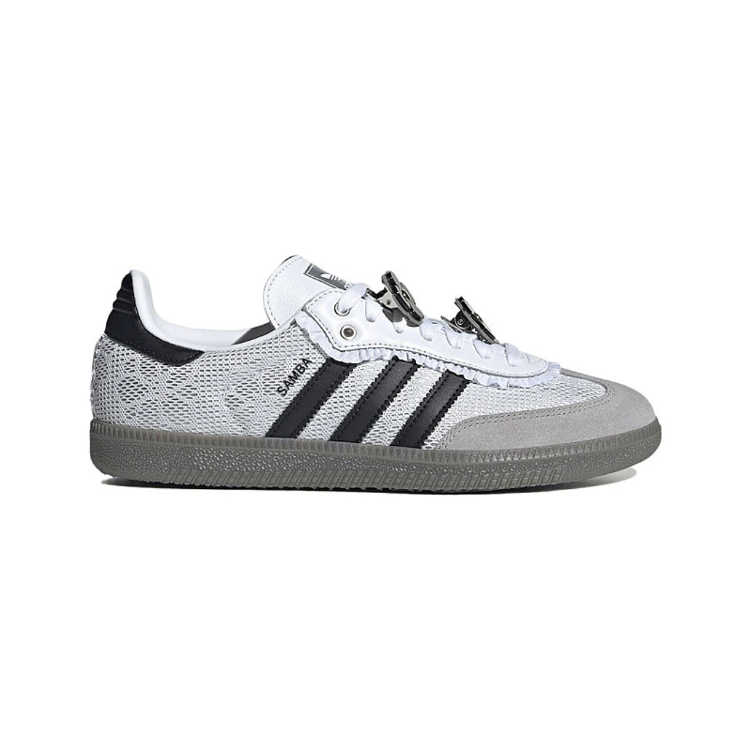 Adidas Samba OG “Lace Flower” (Women’s) memberi sentuhan femininitas yang lembut pada siluet klasik Samba—dengan upper mesh tipis berwarna putih (Footwear White) berlubang mirip renda, dihiasi overlay suede abu-abu tipis, serta tiga garis hitam tetap menjadi penanda warisan Samba yang autentik. Model ini dirilis pada Oktober 2024. Detil yang mencuri perhatian termasuk trim bergelombang lembut di sekitar eyestay dan tumit yang menyerupai tutu kecil, dipadu tali berbentuk pita dan klip bunga Adidas, menciptakan kesan elegan ala balet sekaligus modern. Hasilnya adalah perpaduan apik antara heritage sporty dan estetika couture yang ringan dan anggun, menjadikannya pilihan sempurna untuk pemakaian kasual dengan sentuhan gaya feminin yang tajam.